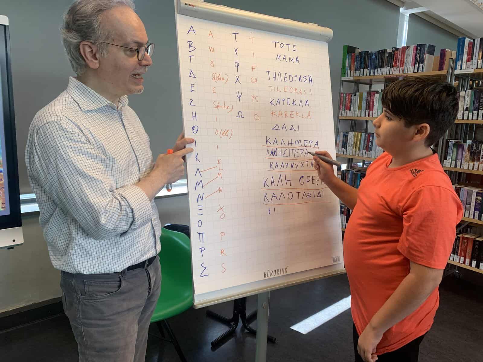 Die Klasse 5a zusammen mit Herrn Wildraut und Frau Flöther hat am Tag der europäischen Sprachen an einem Mini-Sprachkurs Griechisch vom griechischen Kulturinstitut teilgenommen. Er fand um die Ecke in der AGB statt. In einer Stunde haben wir fast das ganze griechische Alphabet gelernt und mit etwas Hilfe sogar einige Wörter geschrieben. Das ist ganz schön kompliziert!