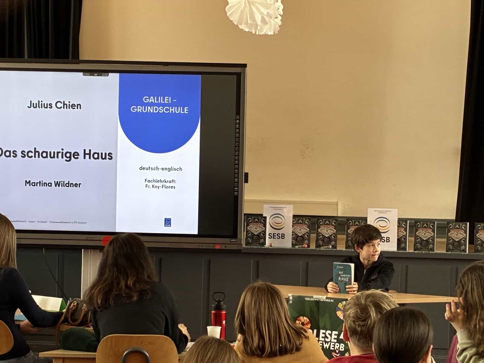 Vergangenen Donnerstag wurde es ernst: Julius trat in der Vorrunde des SESB-Vorlesewettbewerbs (Partnersprache) gegen die besten Vorleserinnen und Vorleser von sieben anderen SESB-Schulen an. Die Konkurrenz war groß, doch Julius behielt die Nerven und überzeugte die Jury auf ganzer Linie.